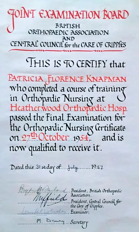 Pat passed her finals in 1954 and On Feb 28th 1955 she moved to St Charles hospital, Ladbroke Grove to train in general nursing. She qualified as S. R. N. in 1957 and was at last able to receive her Orthopaedic Certificate and have S. R. NO. N. C. after her name. Something she was proud of.
